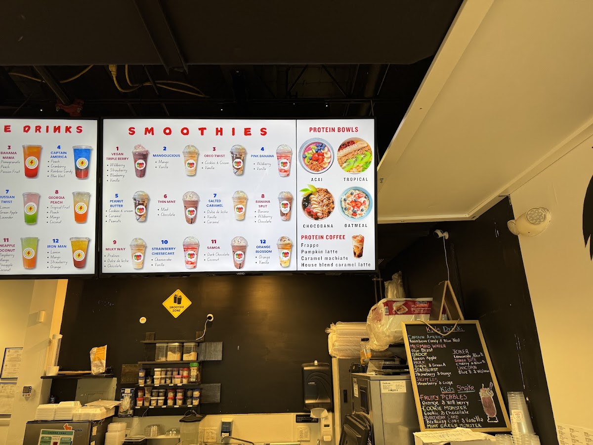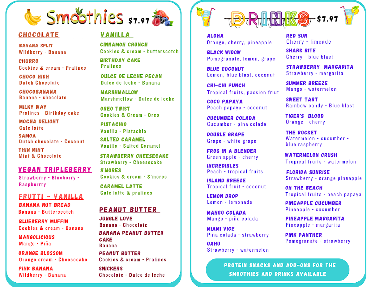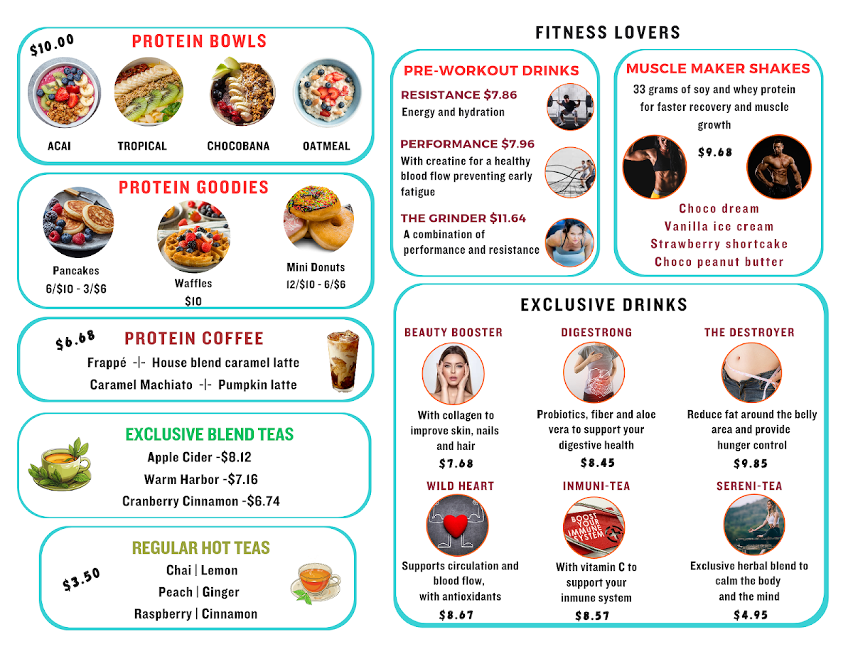 Don’t miss out on the variety of Protein Drinks like Peach/Mango (24 oz cup, 90 calories) and Wild Berry (24 oz cup, 90 calories), or the cozy Hot Herbal Teas such as Apple Cider (20 oz cup, 20 calories) and Cranberry Cinnamon (20 oz cup, 20 calories). To complement your drink, the Protein Bars and tasty Smoothies like Banana Split, Churro, and Milky Way provide a satisfying snack for any time of day.